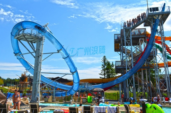 水上滑梯大回環滑梯采用透光玻璃鋼材料,游客置身于緊閉的艙體內,隨著3·2·1的倒數,腳底踏板打開,從16米高的平臺上通過水的潤滑作用,身體如同坐過山車般沿著幾近垂直的滑管高速滑行.具有強烈的視覺沖擊力及觀賞性,讓觀望者也膽戰心驚。